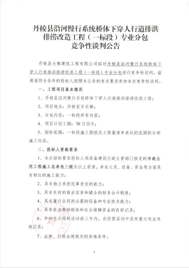 【大雅建筑公司】丹棱縣沿河慢行系統(tǒng)橋體下穿人行道排洪排澇改造工程(一標(biāo)段)專業(yè)分包競(jìng)爭性談判公告
