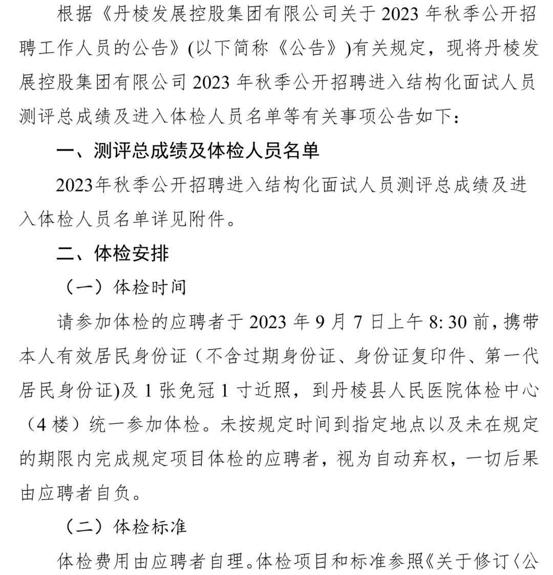丹棱發(fā)展控股集團有限公司關(guān)于2023年秋季公開招聘進入結(jié)構(gòu)化面試人員測評總成績及進入體檢人員的公告